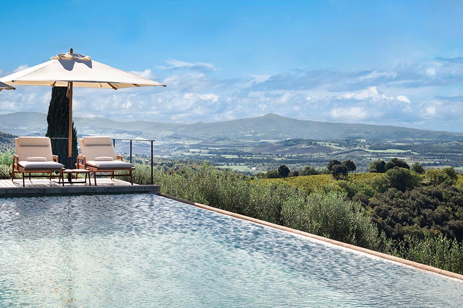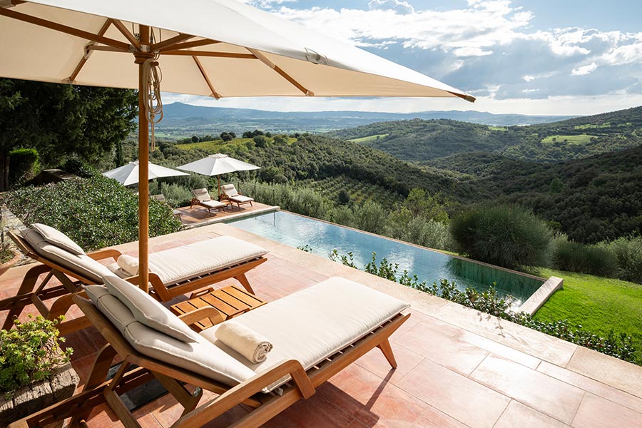 Set amidst the serene beauty of Tuscany’s Maremma, Castello di Vicarello offers a rare escape into a world of timeless elegance. Situated midway between Rome and Florence, this enchanting retreat is surrounded by 40 hectares of organic vineyards, centuries-old olive groves, and the rolling hills of Tuscany.