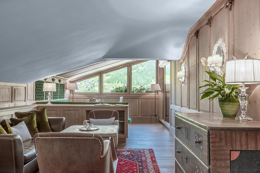 Corvara, Alta Badia, Dolomites. A large mountain house, authentically South Tyrolean, interpreting the Ladin spirit through a Tyrolean lens. Intimacy and warmth are reflected in the details that define the forty-eight rooms. Stuben, local woods, refined textiles and carefully selected furnishings create harmonious spaces where every element is designed to enhance natural light, raw materials and objects of essential character.