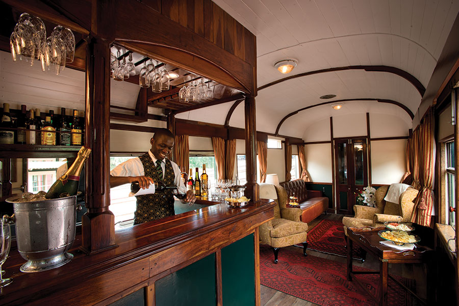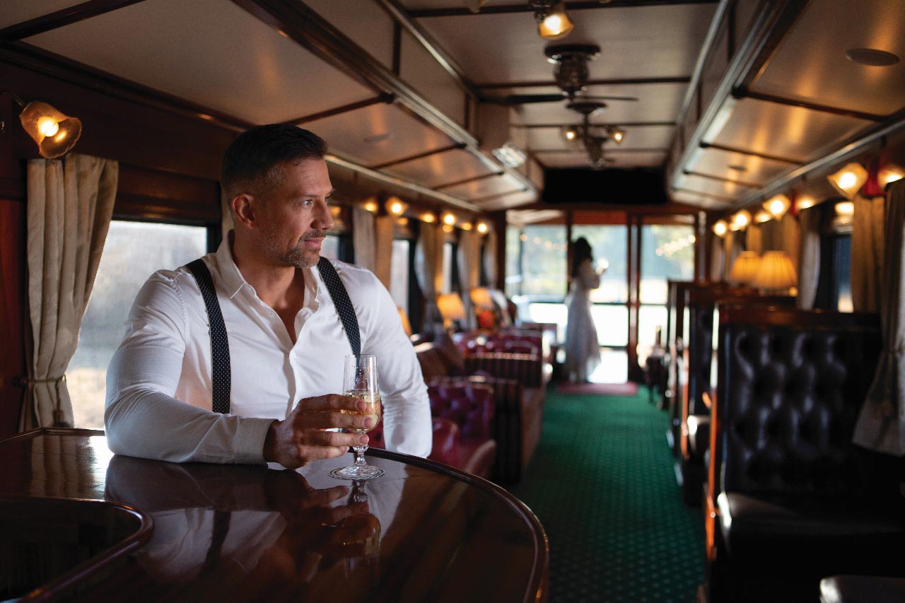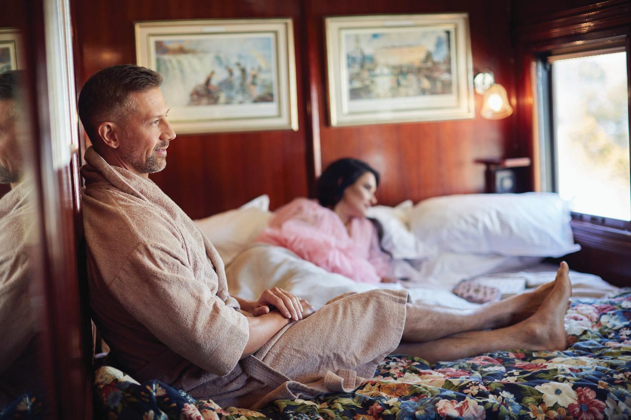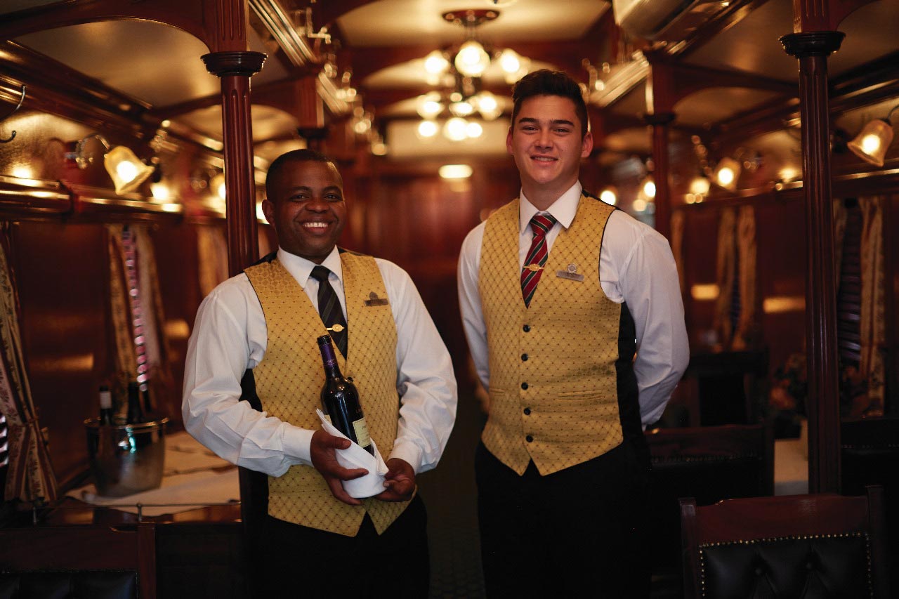 Each train has accommodation carriages, dining cars (±42 seats), a lounge car (±26 seats), small gift shop, smoking lounge (±11 seats) and observation car (±32 seats) with open-air balcony. Maintaining the spirit of a bygone era, there are no radios or television sets on board. The three types of suites available – Pullman (7sqm), Deluxe (10sqm) and Royal (16sqm) – offer passengers privacy and comfort with double or twin beds and fittings and facilities that are of the highest standard. All have en-suites with shower, toilet, basin and bath (Royal only), tea facilities, safes, air conditioning, linen and amenities and are serviced daily. There is adequate storage and small cupboards with hangers and shelves.